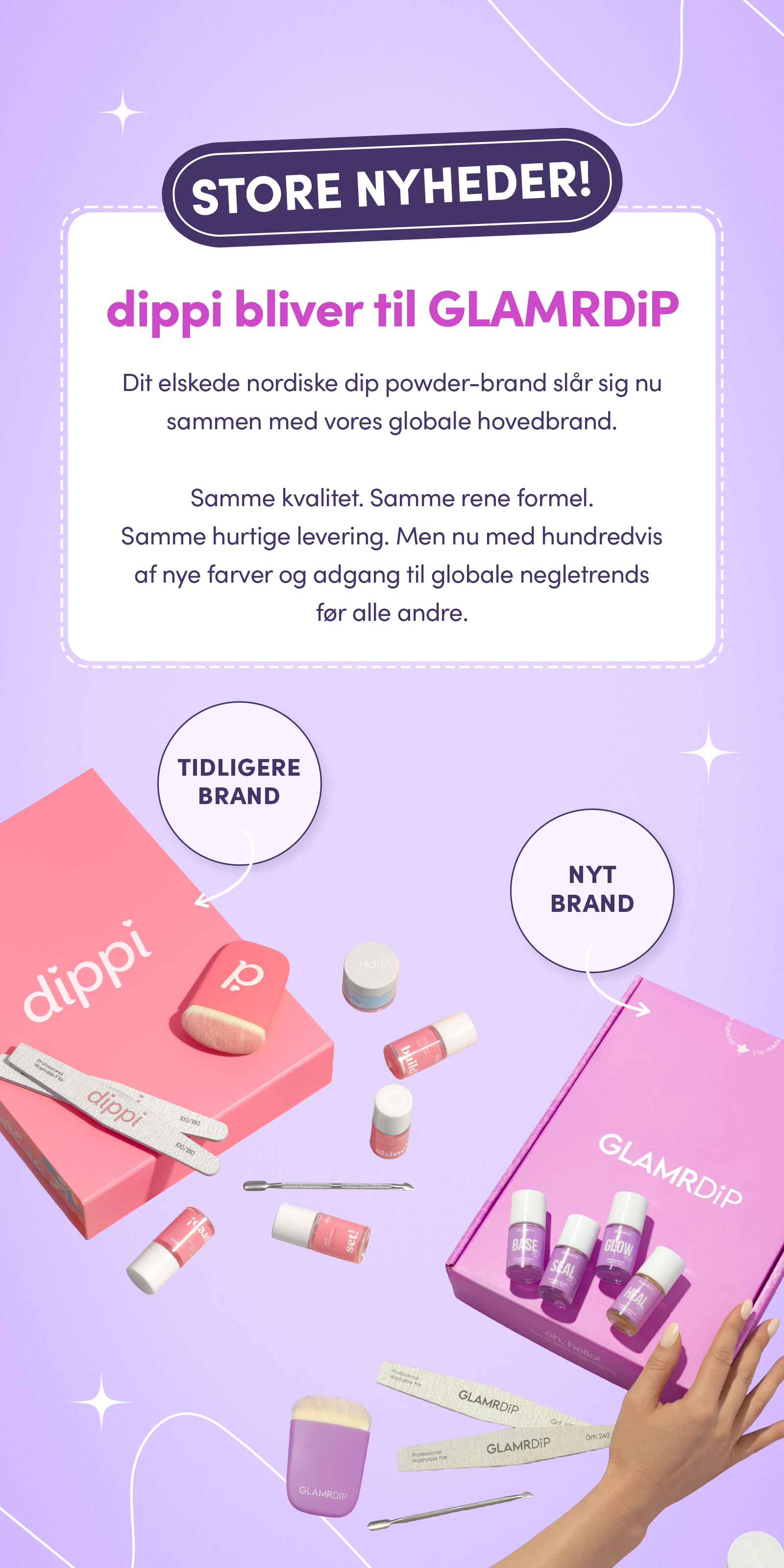 Du vil stadig få hjælp fra det samme lokale kundeserviceteam, som du kender og stoler på. Vi opdaterer blot vores branding, mens vi skifter til GLAMRDiP.